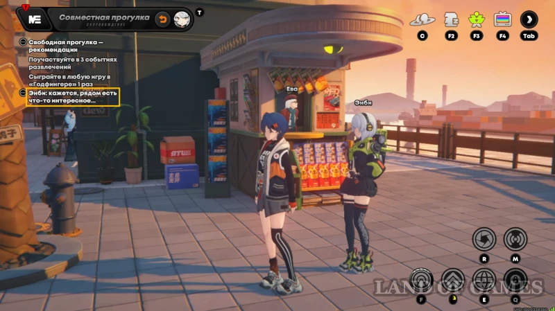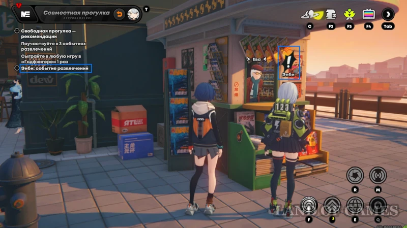 Режим «Совместной прогулки» не привязан к приглашениям в чате и может быть запущен неограниченное количество раз. Зайдите в чат с Энби и кликните по соответствующей кнопке, чтобы попасть в отдельное меню. Тут показаны живые обои, снизу есть значок с наградами и действие «Провести время» – жмем и выбираем место встречи (рекомендованное отмечено квестовой меткой). Во время прогулки в предлагаемом игрой месте, вы столкнетесь с такими мероприятиями: