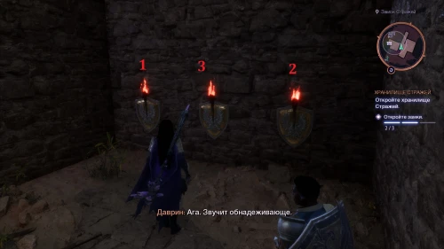 Сразитесь с противниками и спуститесь вниз, где наткнетесь на запертую дверь, открыть которую можно лишь решив головоломку. Вам необходимо нажать три рычага с гербом, доступ к которым вы получите разгадав три загадки.
