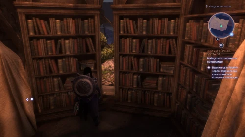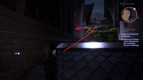 От точки перемещением локации Улицы монетчиков, бегите налево и поднимитесь на крышу. Поверните вправо и запрыгните на крышу соседнего здания. Заверните за угол, и попав на чердак, активируйте полку с книгами, чтобы попасть на балкон с сокровищем.