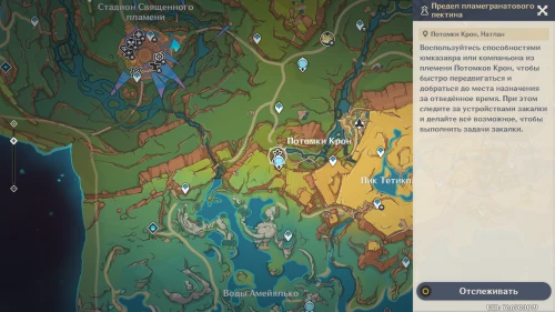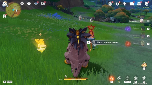 Откройте страницу события и выберите первое испытание. Изучите дополнительные задачи (100 монет испытания и 40 блестящих монет испытания). Далее отправляйтесь к месту челленджа, расположенному неподалеку от поселения Потомков Крон. Затем взаимодействуйте с красным знаком для начала теста.