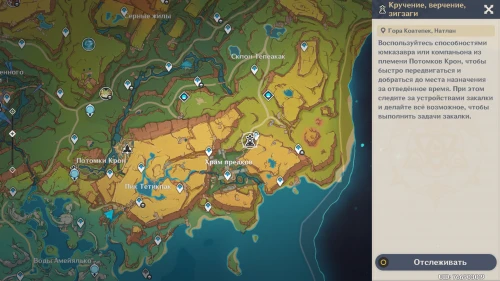 Выберите шестое испытание и телепортируйтесь к телепорту, находящемуся в юго-западной части Очканатлане, на верхушке одного из горных кряжей. Здесь вы обнаружите последний красный маркер. Как обычно, взаимодействуйте с устройством для начала финального челленджа. Перед этим превратитесь в кукузавра.