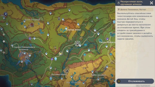 Выберите третье испытание и направляйтесь к реке к югу от Серных жил, где вы обнаружите очередной красный маркер. Здесь также можно будет побеседовать с Шилонен. Снова взаимодействуйте с устройством для начала следующего челленджа. Перед этим превратитесь в тепетлизавра.