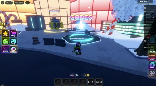 - После загрузки и появления в лобби (стартовая локация), пройдите немного вперед и направо, пока не заметите синий круг, над которым висит надпись «CODES», и войдите в эту зону.