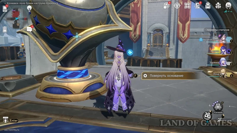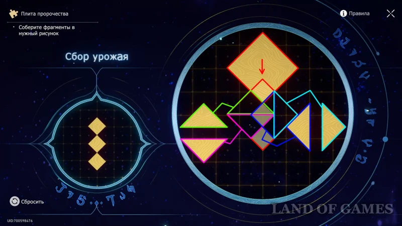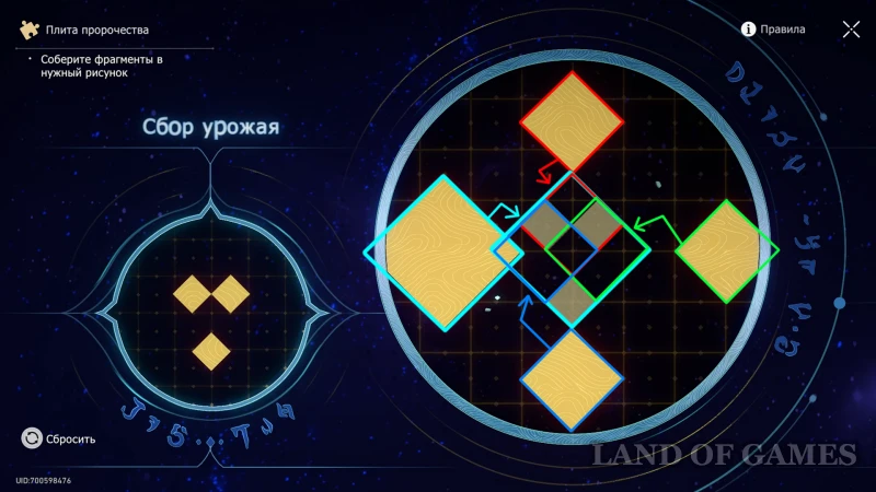 В светлом режиме зала пройдите к метке Плиты пророчества и соберите рисунок «Сбор урожая» (ниже есть подсказка по размещению элементов).