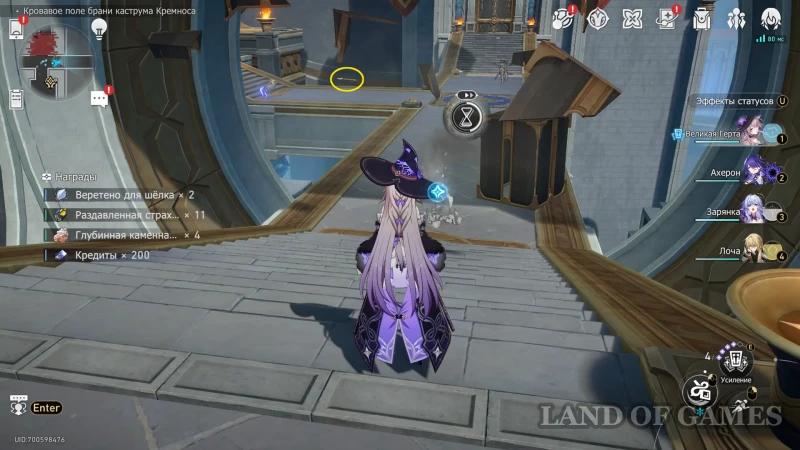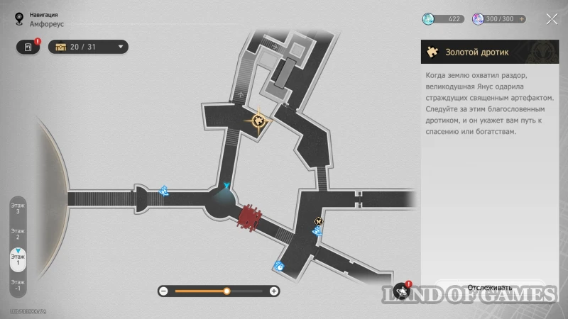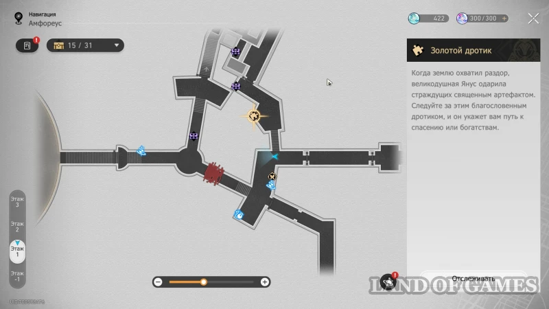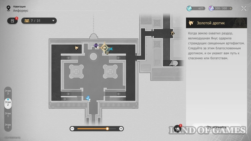 Покинув исследуемую выше трехмерную карту, вы попадете в длинный коридор, ведущий к Золотому льву. Здесь можно получить сразу два трофея, и первый появится, если попытаться поймать жучка по правой стороне участка. В процесс вмешается дух-воришка — предотвратите побег с помощью навыка перемотки времени, отпуская зажатый пробел на долю секунды, когда стрелка попадается в зеленые участки циферблата. После разговора с грабителем, вы получите 40 нефрита и 60 небесной амброзии, а жука можно собрать для местной Швеи Аглаи.