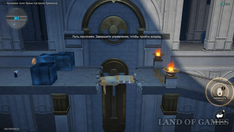 Для получения последнего жетона летите к каменному кубу (изначально он стоит перед промежутком, в который можно разместить руку), подберите фигуру и установите ее на мерцающий участок в юго-восточной половине двора (в углубленную арку с сине-золотыми элементами) — после размещения объекта сверху появится монетка.