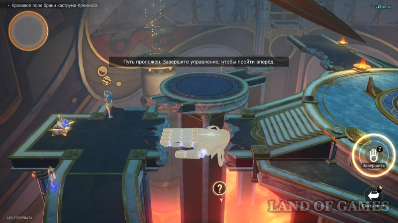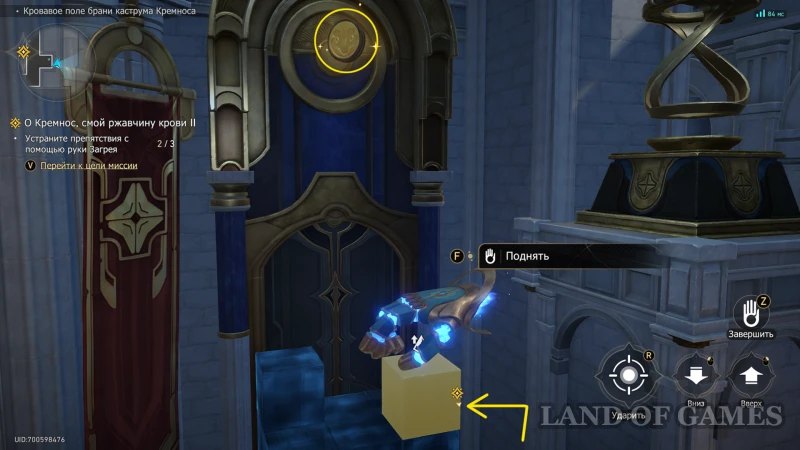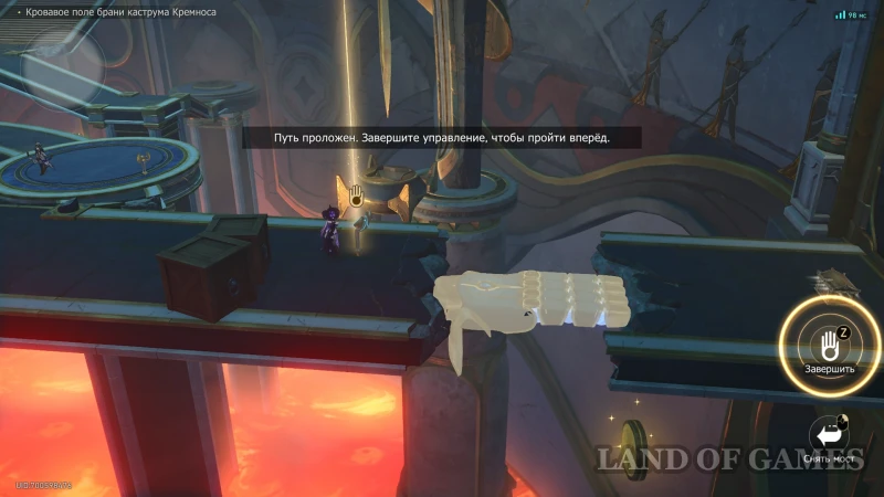 Пройдите к пульту управления рукой Загрея на краю в верхней половине локации: перед ним есть дыра с силуэтом ладони, а за ней сундучок. Чтобы его получить, активируйте руку и установите ее в качестве мостика на золотую метку.
