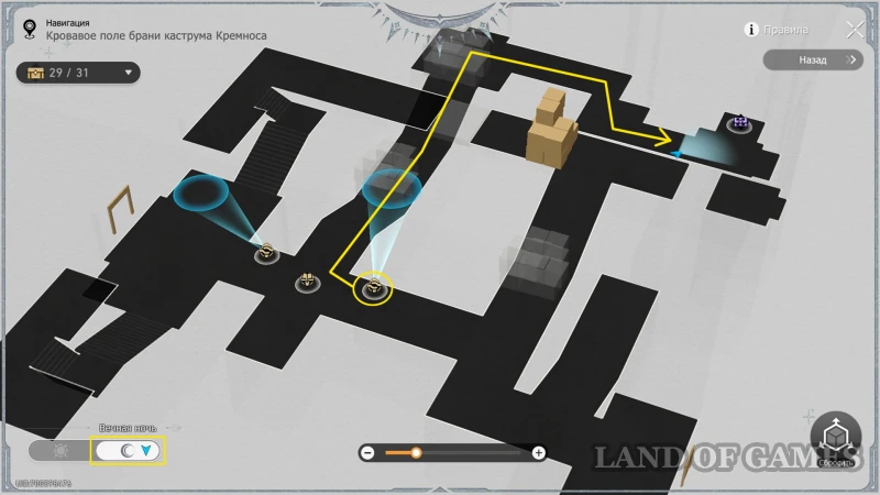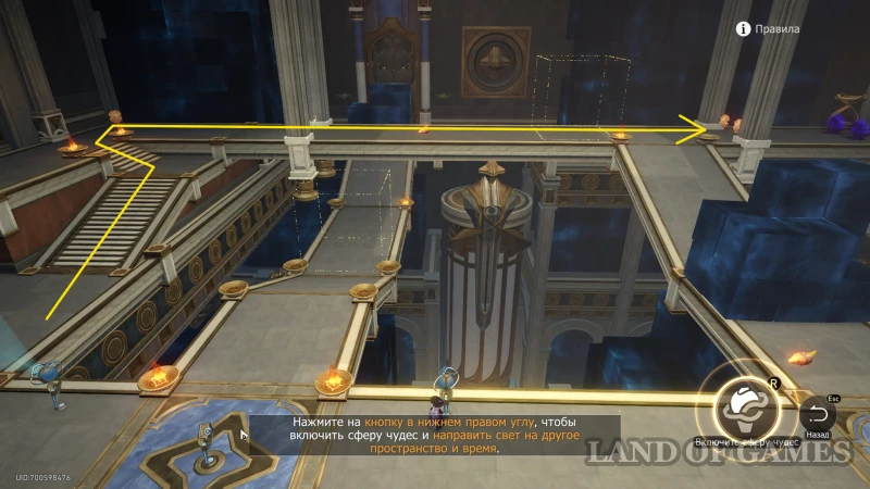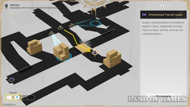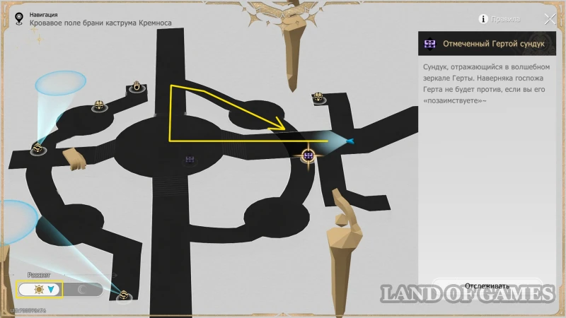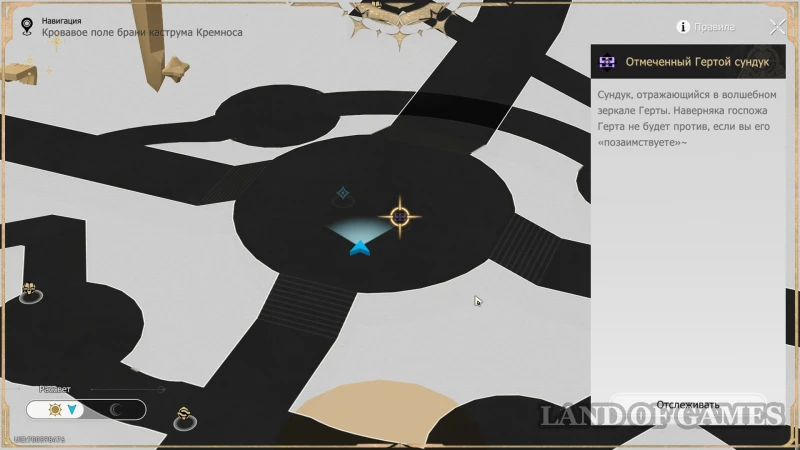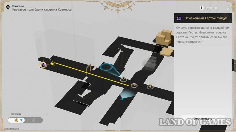 Оставьте карту в режиме Рассвет, активируйте Сферу чудес справа от книжки и проверьте, чтобы та не была направлена на стопку кубов в верхней половине комнаты (механизм можно просто выключить на «R»). Затем бегите наверх и до конца тропинки, которая упирается в двух врагов, охраняющих обычный сундучок.