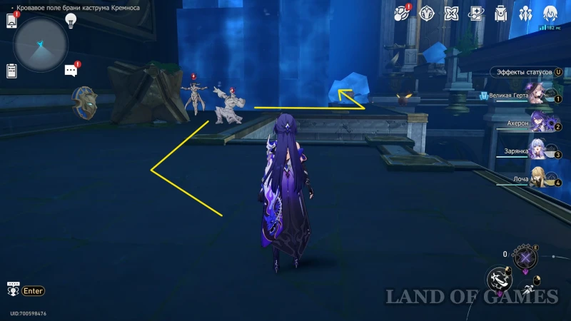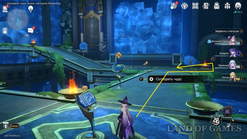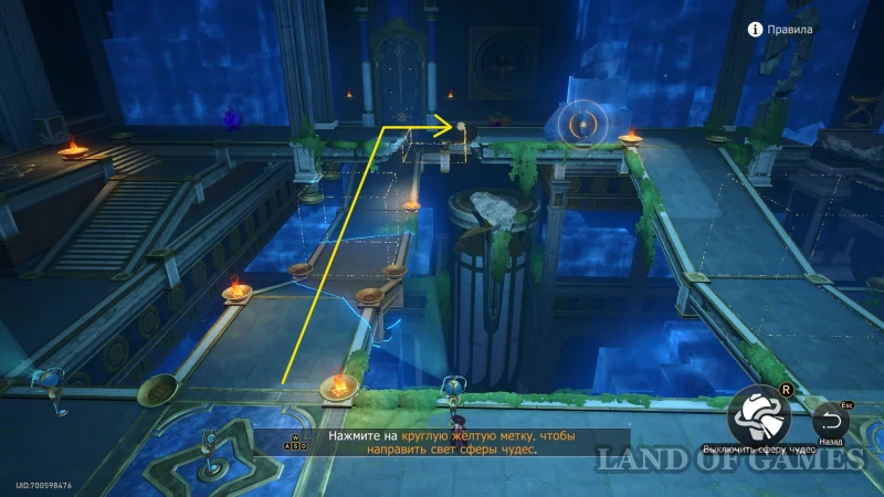 Активируйте сферу чудес справа от лицевой стороны книжки и наведите прожектор на большой куб слева так, чтобы освободить дорожку перед книжкой. Двигайтесь вперед, а затем поворачивайте направо, минуйте пару каменный врагов, и продолжайте идти, пока не наткнетесь на углубление в голубой породе — здесь притаилась лучница, мешающая спокойно забрать обычный сундучок.
