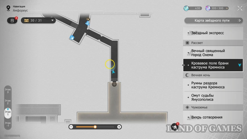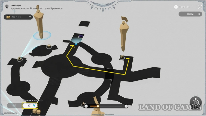 Осталось собрать трофеи на круглой 3D-карте к западу от якоря «Парадная арка ковки душ». Первый сундучок нужно собирать только в режиме Рассвета (его можно установить с помощью любой Книги чудес). Попав сюда через ближайший к указанному выше якорю вход, идите в центр, а затем сверните направо и спускайтесь по кольцевой тропинке вниз — по пути увидите 29-й сундучок.