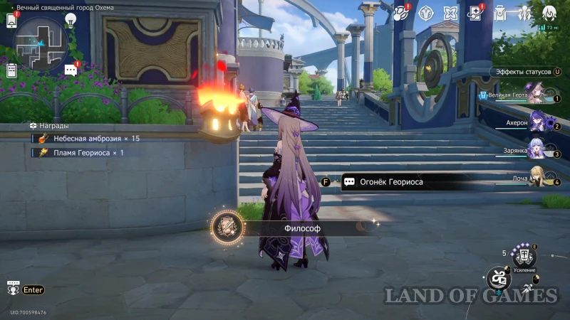- «Философ» (+5 нефрита) — выдадут после того, как вы найдете и отдадите дары всем восьми Огонькам Геориоса.