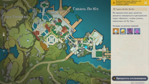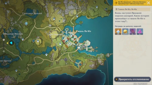 Снова подождите два игровых дня, воспользовавшись меню Паймон, а потом направляйтесь на террасу Юйцзин. Ху Тао попросит вас сопроводить ее для передачи подарков друзьям в рамках Праздника морских фонарей.