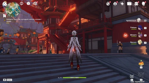 Отправляйтесь в гавань Ли Юэ и пройдите к квестовому маркеру на деревянном мосте для начала кат-сцены. Там вы повстречаете Ху Тао и Сян Лин. После беседы с ними пройдите в северную часть города и погуляйте по ярмарке, где вы увидитесь с Кэ Цин и Лань Янь. Познакомившись с новой девушкой, идите на восток к праздничным ширмам.