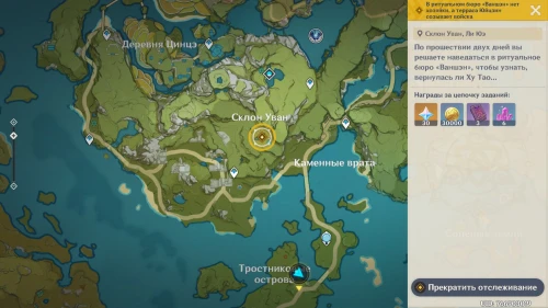 Переместитесь к телепорту возле Склона Уван и пройдите в центр отмеченной области. Вы обнаружите здесь хиличурлов – разберитесь с ними. При осмотре развалин вы обнаружите Е Лань, которая расскажет вам об аномалии и предложит побеседовать с Нин Гуан. Возвратитесь в гавань Ли Юэ и пообщайтесь со старой подругой.