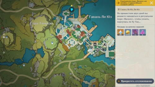 Первым делом направляйтесь в хижину «Бубу» и пообщайтесь там с Ци Ци и Бай Чжу. Затем отправляйтесь к Юнь Цзинь, которая будет ждать вас на причале в северной части города. Далее двигайтесь в ресторан «Народный выбор», где сможете побеседовать с Сян Лин. В конце возвратитесь в ритуальное бюро и получите монету удачи и памятную вещь от Ху Тао.