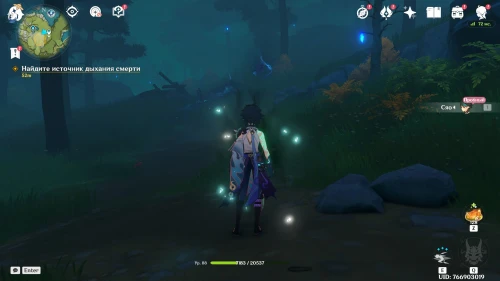 Вы возьмете под управление Сяо. Бегите вперед, следуя за темно-синим воздушным течением, и атакуйте клубки дыма, чтобы увидеть следующие подсказки. По дороге разберитесь с несколькими хиличурлами. Последний клубок дыма будет находиться возле булыжника (показан на скриншоте ниже).