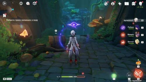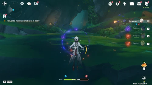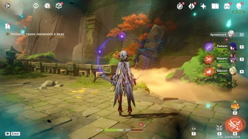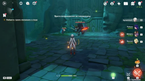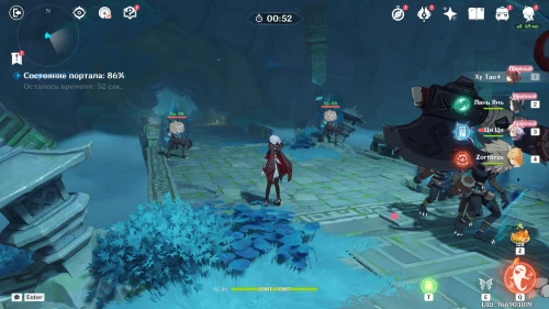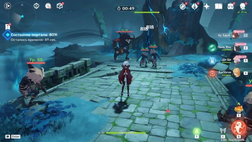Далее вам нужно будет в течение 1 минуты удерживать монстров, не давая им разрушить портал. При этом вы будете управлять Ци Ци, Путешественником (Пиро), Лань Янь и Ху Тао. Первые трое будут карманными саппортами, а основной урон наносите Ху Тао, используя ее элементальный навык и ульту (для восстановления здоровья).