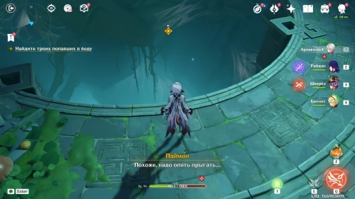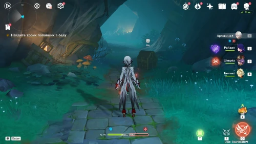 Найдя все фигурки, вы окажитесь в темном пространстве. Бегите вперед и спрыгните в дыру, чтобы оказаться еще ниже. Здесь вы обнаружите драгоценный сундук. Продолжайте двигаться дальше, и в итоге вы найдете Ху Тао, Лань Янь и Ци Ци.