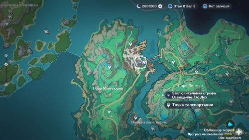 Спланируйте вниз к каменному кубу, а затем нажмите клавишу «Т», чтобы увидеть узел, который нужно атаковать, дабы развеять его. Теперь можете открыть дверь. Пройдите внутрь и разберитесь с хиличурлами. Затем отворите следующие врата и заберите сокровище из обычного сундука.