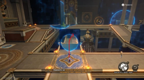 Возвратитесь к самой первой Сфере чудес рядом с книгой и снова направьте ее свет на огромный куб впереди. Затем перейдите ко второй Сфере и направьте ее свет влево, как продемонстрировано на скриншотах ниже. Тем самым вы разблокируете дорогу к третьему сундуку.