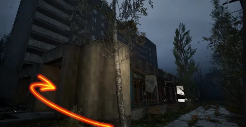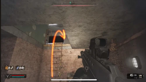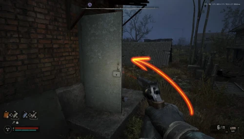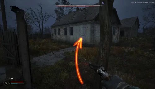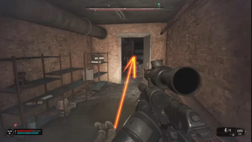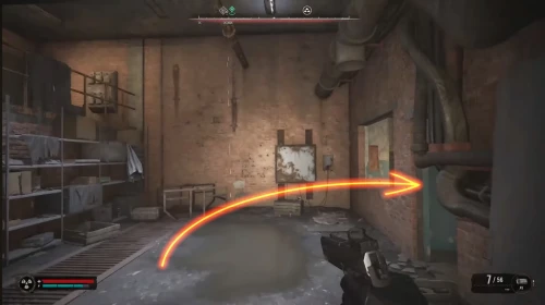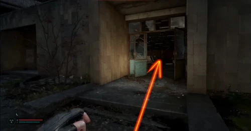 Флешку с первым чертежом вы сможете получить в регионе Припять, в локации «Белый дом». Зайдите внутрь через вход, указанный на скриншоте. Схрон с чертежами переделки под калибр вы отыщите внутри лабиринта из старой мебели.