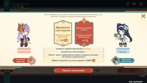 После начала испытания начните управлять блоками, спускающимися вниз, перемещая их в выгодные для себя позиции. При совпадении от 4 и более фрагментов одного цвета они будут уничтожены, а ваша фигурка при этом ударит соперника и нанесет ему урон (зависит от количества уничтоженных блоков).