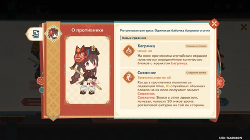 Первым делом советуем вам изучить особенности своего противника, которые указаны на его страничке, чтобы правильно выбрать фигурку под оппонента. В данном случае мы советуем вам взять Одинокую бабочку багрового огня.
