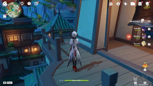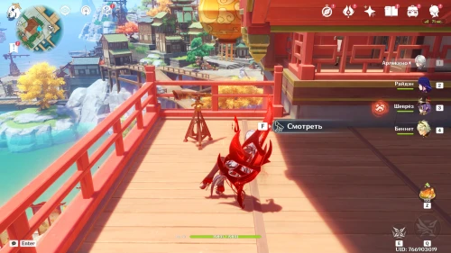 Вернитесь к предыдущему телепорту, но теперь двигайтесь строго на юг, поднявшись на крышу красного здания. На башне с колоколом вы обнаружите еще одну подзорную трубу – взаимодействуйте с ней и сделайте снимок танцующих хиличурлов.