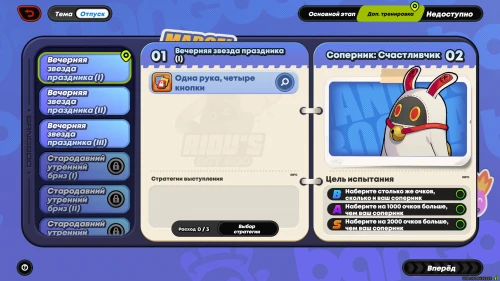 Затем поднимитесь наверх и поговорите с Пейдж для участия в дополнительной тренировке «Вечерняя звезда праздника 1». В основном меню выберите режим «Эн-нута славы, а потом следуйте инструкции по выбору стратегий. Далее возьмитесь за прохождение испытания, выбрав для начала правильный наряд: Отпускные ушки, шарф и одежду.