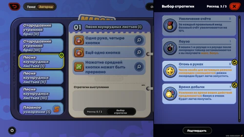 Поднимитесь наверх и пообщайтесь с Пейдж для участия в дополнительной тренировке «Песня изумрудных листьев». Выберите в качестве стратегий «Время добычи» и «Огонь в руках». Затем наденьте на своего банбу Загородный костюм и начните поединок.