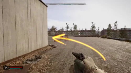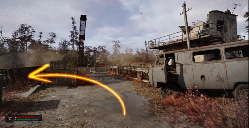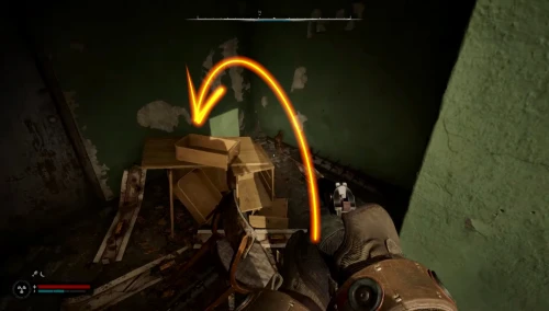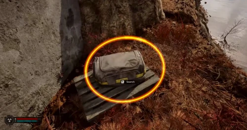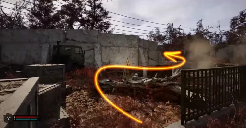 Бегите к бетонной стене слева, где ориентиром будет служить небольшой знак радиации. Обойдите колючую проволоку и следуйте вдоль этой стены, пока не доберетесь до сумки, оставленной на деревянном поддоне.