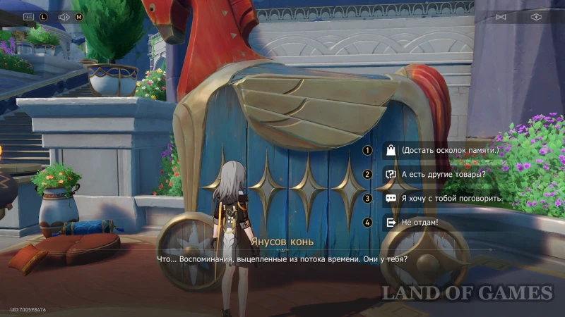 Янусов конь в ХСР (Honkai: Star Rail) является крупной деревянной фигуркой коня на колесиках и встречается в нескольких экземплярах по всему Амфореусу. Большинство лошадок связано с мини-квестами, но есть и особый конь-торговец, у которого можно потратить Осколки памяти.