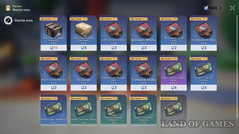 - (Достать осколки памяти) — это вкладка с товарами, среди которых есть рецепты, музыкальные пластинки и «таинственные подарки»;