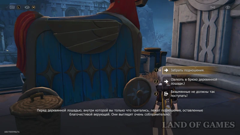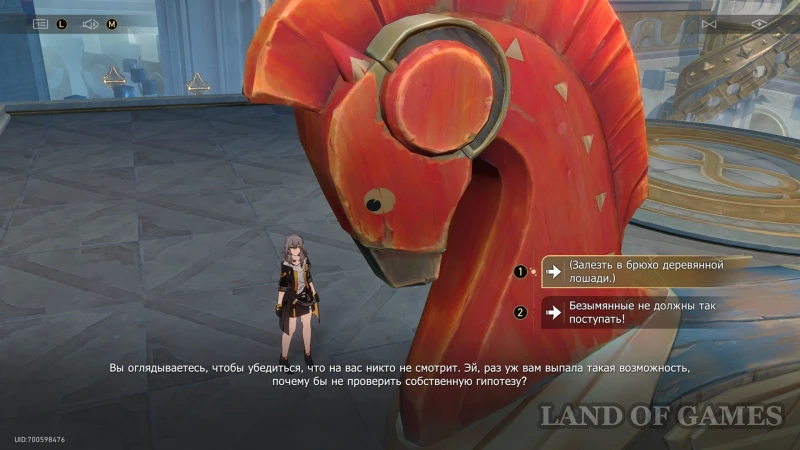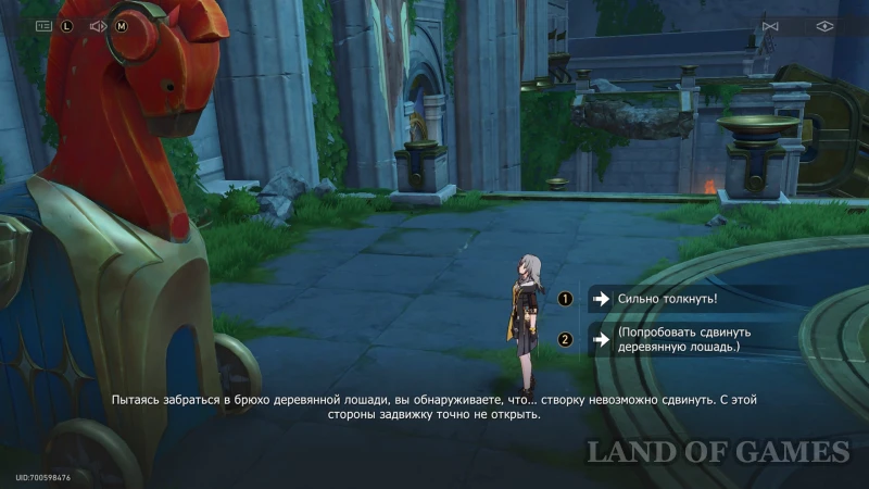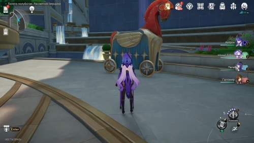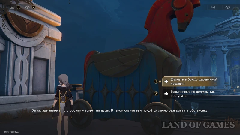Переместитесь к якорю «Палата полубогов: Передний двор» в указанной области, а затем пройдите направо, и вы почти сразу же увидите перед собой коня. Взаимодействуйте с ним и выбирайте любые ответы, после чего у вас разблокируется ачивка Земледелец и деревянная лошадка.