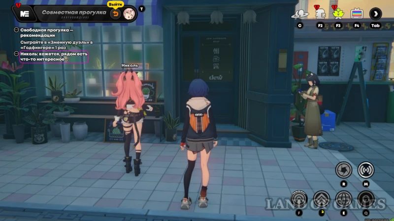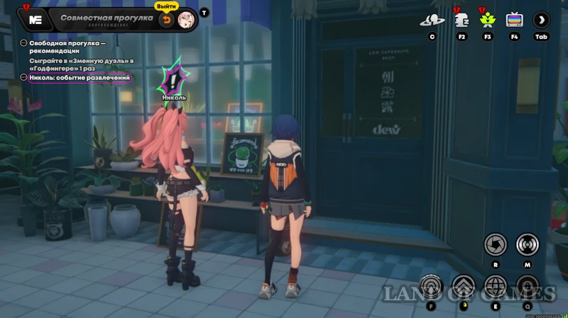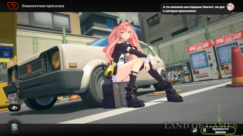 Режим «Совместной прогулки» не привязан к приглашениям в чате и может быть запущен неограниченное количество раз. Зайдите в чат с Николь и кликните по одноименной кнопке, чтобы попасть в отдельное меню. Тут показаны живые обои, снизу есть значок с наградами и действие «Провести время» – жмем и выбираем место встречи (рекомендованное отмечено квестовой меткой). Во время прогулки в предлагаемом игрой месте, вы столкнетесь с такими мероприятиями: