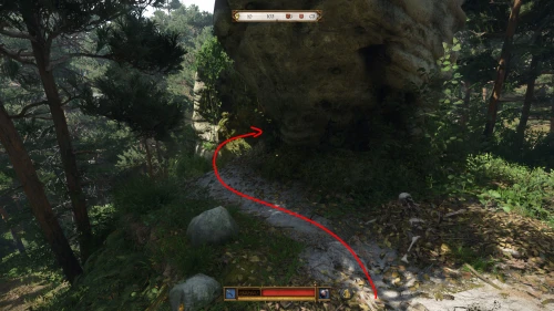 Вы узнаете, что Вашек и его напарник смогли украсть и спрятать некоторые вещи из повозки в укромном уголке. Переместитесь к придорожному знаку «Аполена», а затем начните идти на север по тропинке, как показано на картинках ниже, пока не окажитесь перед большими каменными выступами.