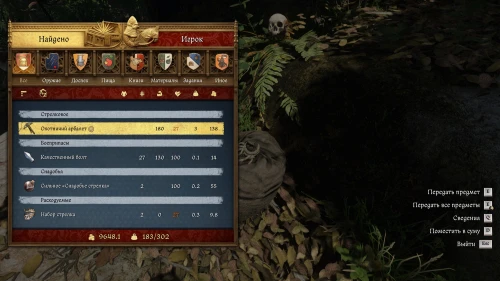Продолжайте двигаться в северном направлении, поднявшись по тропинке наверх, а потом тут же сверните влево и пройдите под каменную арку с правой стороны. Здесь вы обнаружите мешок, лежащий рядом с черепом. Внутри него спрятаны качественный болты х27, охотничий арбалет, наборы стрелка х2 и сильное «Снадобье стрелка» х2.
