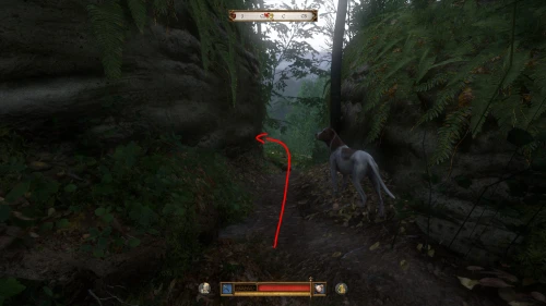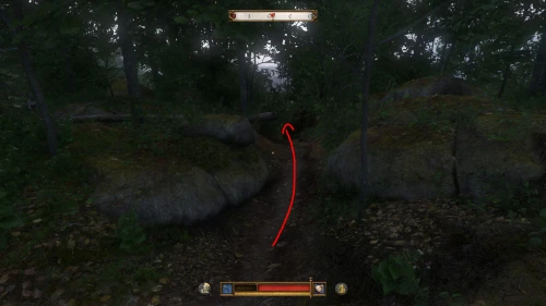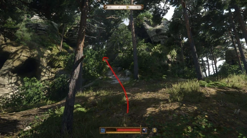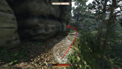Ее можно обнаружить в районе Аполены, где ранее вы могли выполнить квест «Прогулка» и найти украденные товары по карте батрака Вашека. Переместитесь к одноименному придорожному знаку, а затем двигайтесь на север по тропинке, как показано на скриншотах ниже. Оказавшись возле каменного выступа, поднимитесь чуть повыше по дорожке, а потом сверните вправо и обойдите скалу, пройдя налево.