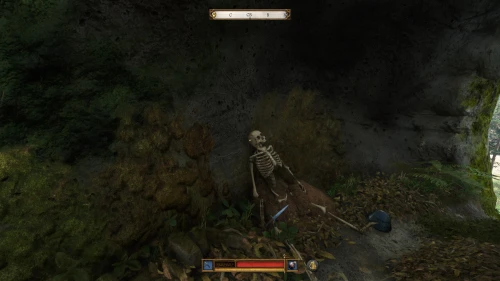 В итоге вы окажитесь в небольшом туннеле в скалах, в конце которого к стене будет прислонен скелет. Возле него можно подобрать шапель и кинжал. Если взглянуть на стену слева от черепа, то вы увидите выбитую на поверхности карту, указывающую на некое сокровище, – осмотрите ее, чтобы Индро прокомментировал вашу находку.