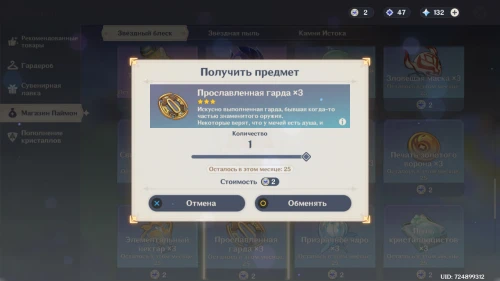 Бутоны и гарды разного уровня редкости можно также приобрести в магазине Паймон за звездные пыль или блеск. Более редкие материалы можно создать из менее редких на алхимическом верстаке.