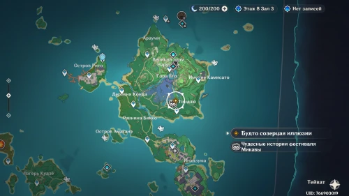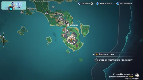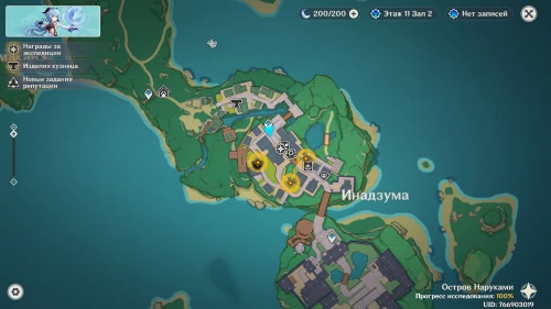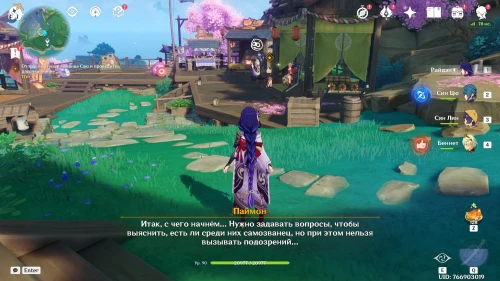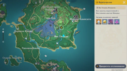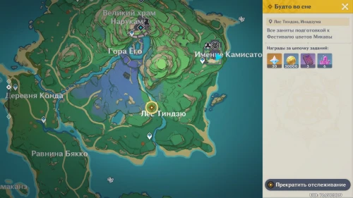 Первым делом дождитесь утра следующего дня (07:00-09:00), воспользовавшись часами в меню Паймон. Далее отправляйтесь в место проведения фестиваля и подойдите к квестовому маркеру. Вы увидите подозрительного человека и решите проследить за ним. В итоге вы встретитесь с Сарой, Хэйдзо и Эи, которые разъяснят вам ситуацию.