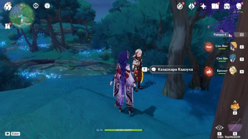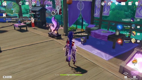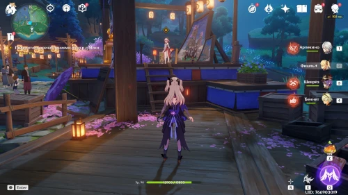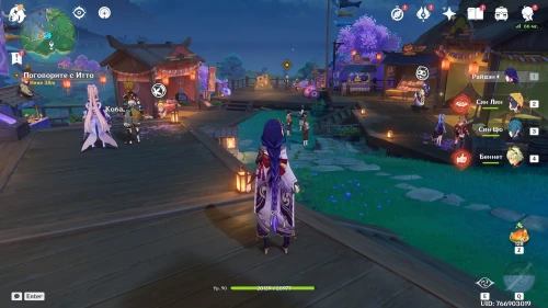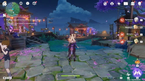 Идите к финальной точке, пройдя через мост. Вы заметите, что Гебу Кобан пытается подойти к Кокоми, разговаривающей с Горо и Мидзуки. Все они согласятся принять участие в празднике. Теперь отправляйтесь в Имение Камисато, где тут же начнется ролик с Аякой. Затем поболтайте с Аято и Мико.