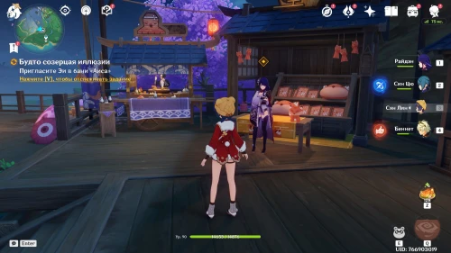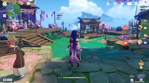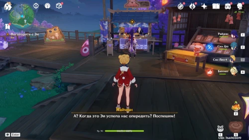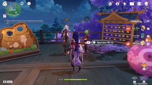 В конце подойдите к стенду Мидзуки и Кокоми, правда, вначале вы обнаружите здесь только Гебу Кобана. Остальные члены команды подойдут чуть позднее. Затем начнется кат-сцена, в которой Яэ Мико представит сегуна Райдэн в качестве участника фестиваля. Походите с ней по ярмарке.