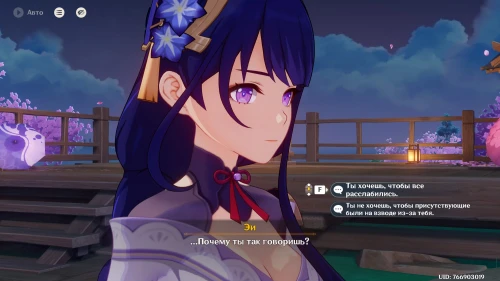 Затем к вам подойдет Мидзуки и пригласит вас всех в баню, но Эи откажется. Далее поболтайте с екаем один на один. Потом она оставит вас наедине с Эи – можете выбирать любые ответы, так как вы в любом случае сможете уговорить ее сходить в бани. Потом прокрутите время на 21:00-24:00 и снова поболтайте с Электро Архонтом.