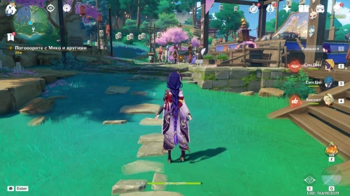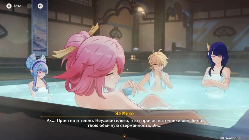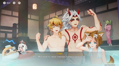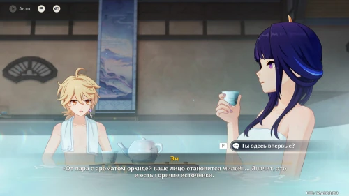 Скажите, что готовы идти, чтобы автоматически перенестись в бани в городе Инадзума. Затем послушайте рассказ Эи, после чего появятся Мидзуки и Мико, которые присоединятся к нам в горячей ванне. Однако ваш отдых будет прерван чьим-то криком снаружи. Просмотрите новый ролик.