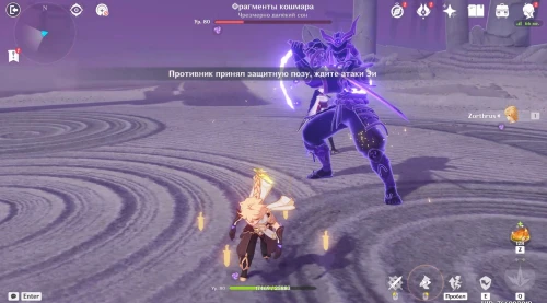 Затем гляньте ролик, в котором появится фрагмент кошмара. Сегун Райдэн тут же затянет его в свою реальность. Далее вам предстоит сразиться с боссом, причем вам на помощь придет сама Эи. Как и в прошлый раз, вам необходимо будет блокировать атаки врага (клавиша «Е»), а также использовать обычные атаки (ЛКМ) и мощные удары (клавиша «Q»).