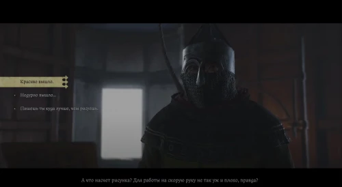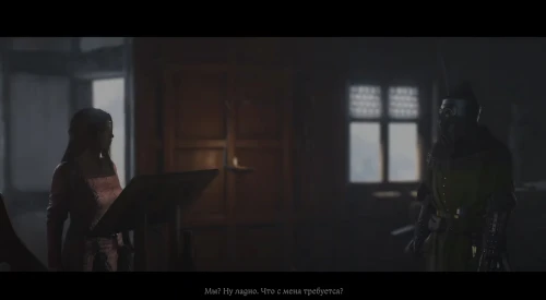 Если после сражения вы испачкались в крови, то обязательно смойте с себя всю грязь в бадье, стоящей снаружи, и наденьте свой лучший наряд. Оказавшись в комнате пани, вновь пообщайтесь с ней и выберите следующие варианты ответов: