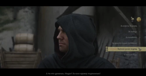 Снова возьмитесь за продвижение по сюжету и во время миссии «Civitas Pragensis» вы вместе с друзьями будете выпивать в корчме Сухдола. В этот момент вы сможете поднять тост. Выберите ответ «За красоту нашей Катерины!»