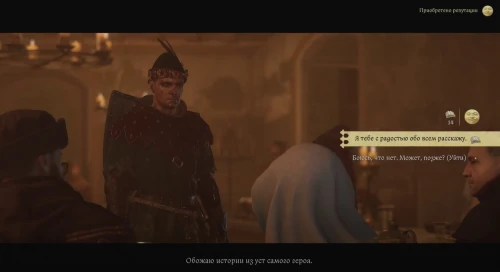 После просмотра первого ролика на банкете вы сможете свободно общаться со всеми гостями. Подойдите к вдове Йоханке из Жернова, которая сидит рядом с отцом Никодимом. Она захочет послушать о ваших приключениях, и во время этого рассказа вам предстоит выбирать правильные ответы, проходя проверки навыков, чтобы завести интрижку с женщиной.