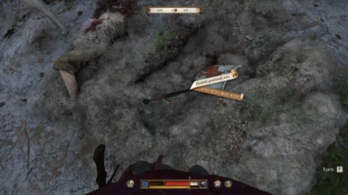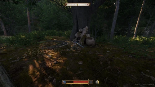 К счастью, это не единственное место, где вы можете обнаружить этот клинок. Доберитесь или переместитесь к Замку Троски, а затем просто скачите на север в лес. Спуститесь вниз и дойдитеь до точки интереса «Свежие могилы». Здесь раскопайте три могилы и осмотрите тела, чтобы отыскать у одного из них Рыцарский меч.